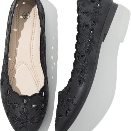 Women’s Comfortable Dress Shoes Ballet Flats Slip On Shoes Black Flats Round Toe PU Leather Flats Summer with Floral Eyelets