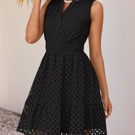 women Summer Sleeveless Mini Dress V Neck Hollow Out Eyelet High Waist A Line Swing Short Party Dresses
