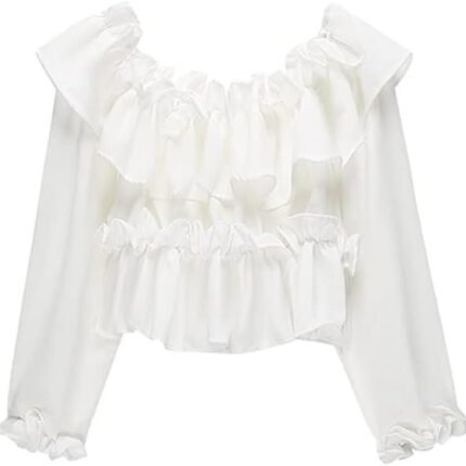 Women Slash Neck Off Shoulder Ruffle Tops Baggy Puff Sleeve Pleated Blouses