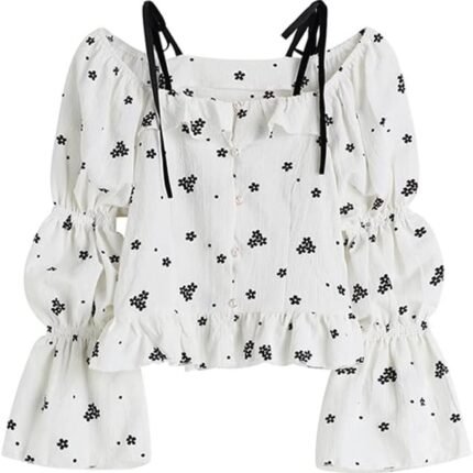 Retro Floral Print Women Blouses Baggy Puff Sleeve Ruffle Top Slash Neck Off Shoulder Clothes