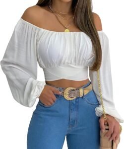 Woman Off Shoulder Ruched Tie Back Crop Top Summer Lantern Sleeve Boho Shirt Blouse