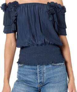 About this item Short sleeve Pleated sleeve detail Flower embellishment Smocked hem Off shoulder neckline