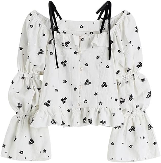Retro Floral Print Women Blouses Baggy Puff Sleeve Ruffle Top Slash Neck Off Shoulder Clothes