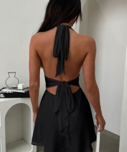 women Halter Deep V Neck Flowy Chiffon Bow Tie Backless Summer Mini Dress