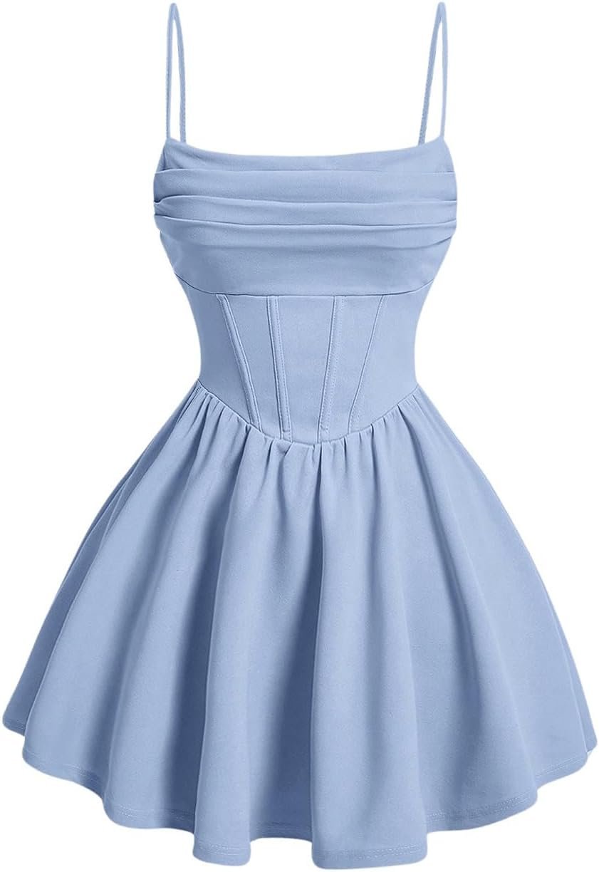 women Ruched Corset Dress Spaghetti Strap Fit and Flare Flowy Skater Mini Cami Dress
