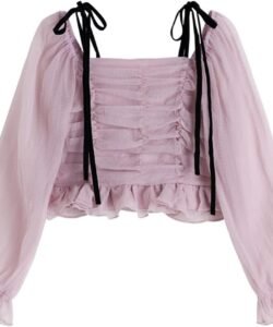 Off Shoulder Pleated Mesh Shirt Women Sweet Vintage Square Collar Long Sleeve Ladies Chiffon Tops