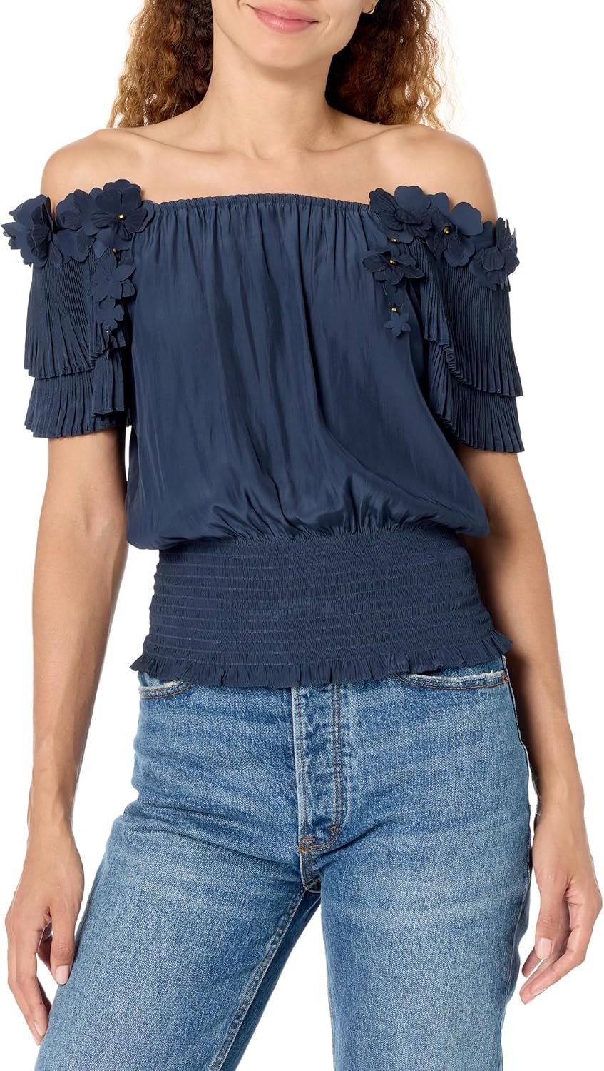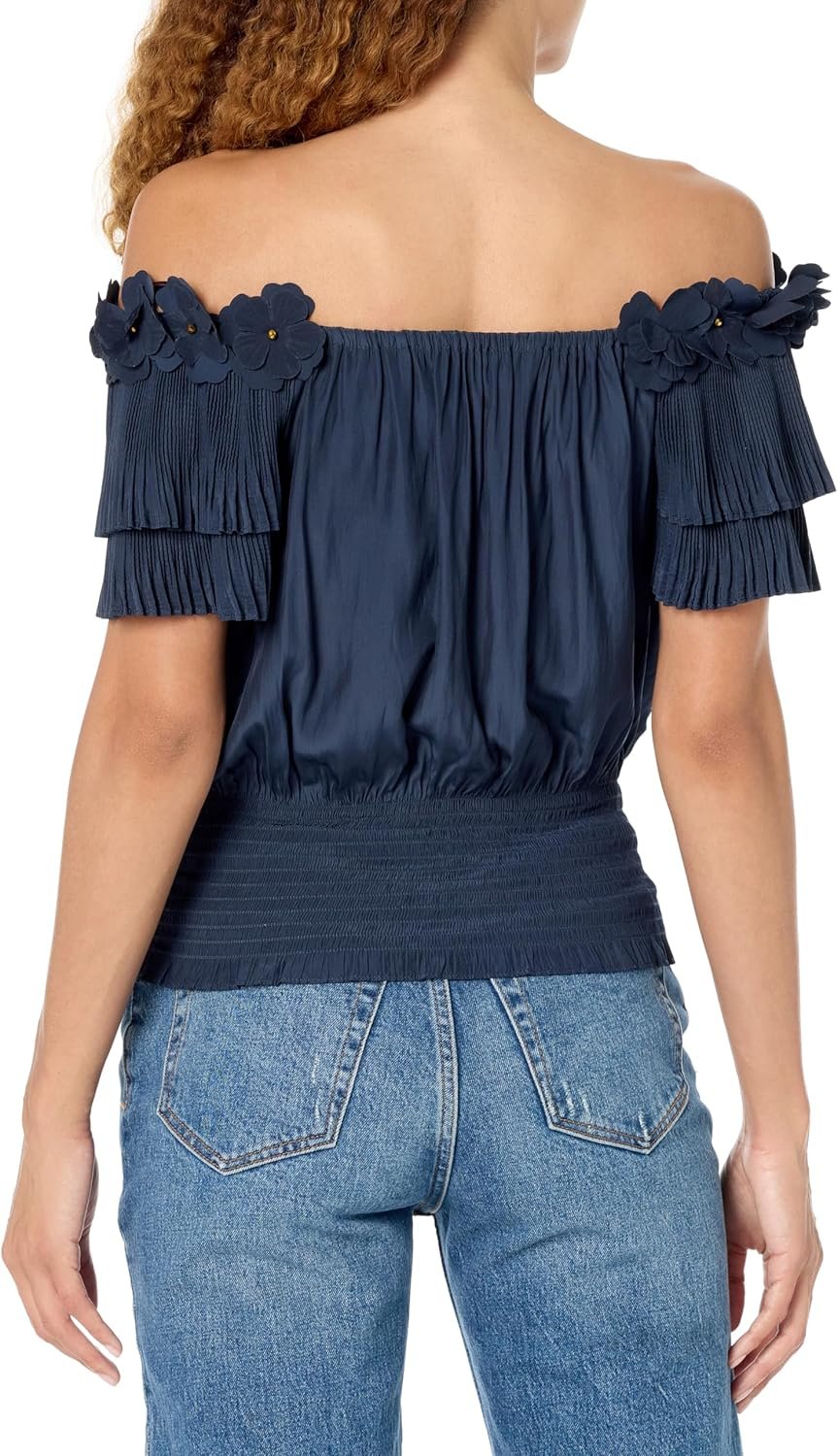Women Slash Neck Off Shoulder Ruffle Tops Baggy Puff Sleeve Pleated Blouses